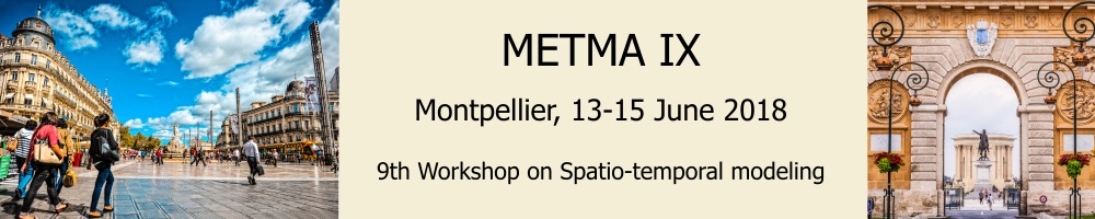 Home The proceedings containing the extended abstracts are now available here (pdf file). This conference aims to promote the development and application of spatial, temporal, and mainly spatio-temporal statistical methods in different fields related to the environment. It seeks to bring together practitioners and researchers of different areas and countries all over the world. Cross-disciplinary actions to solve environmental problems are very welcome. The scientific program features sessions covering topics on the latest advancements in theory, methods and applications. Contributed papers and posters are welcome. METMA 2018 is the ninth of a series of workshops on the topic of Spatio-Temporal Modelling, which have been held every two years since 17 years. We are proud to organize the first "French" edition of this event in Montpellier. The previous conferences have been organized in Benicassim (Castellon, Spain, 2001), Granada (Spain, 2004), Pamplona (Spain, 2006), Alghero (Italy, 2008), Santiago de Compostela (Spain, 2010), Guimaraes (Portugal, 2012), Turin (Italy, 2014) and Valencia (Spain, 2016). As a satellite event, a short course will be held on Tuesday, June 12, 2018: An introduction to geostatistical analysis of spatio-temporal data with R. More details on this workshop can be found under "Program". The Spatial Statistics journal will edit a Special Issue for METMA IX. More details on the call for papers will follow soon. The prospective participants of the workshop are kindly asked to check for updates on this conference web site from time to time. We warmly acknowledge financial and organisational support from AgroParisTech, CNRS (Centre National de Recherche Scientifique), the Institut Montpelliérain Alexander Grothendieck (Montpellier University), Inria, the LEFE-CERISE project funded by INSU-CNRS, MUSE (Montpellier Université d'Excellence), MSH Sud (Maison des Sciences de l'Homme, Montpellier) LabEx NUMEV, the RESSTE network of INRA, and Société Française de Statistique (the French Statistical Society), among others.
